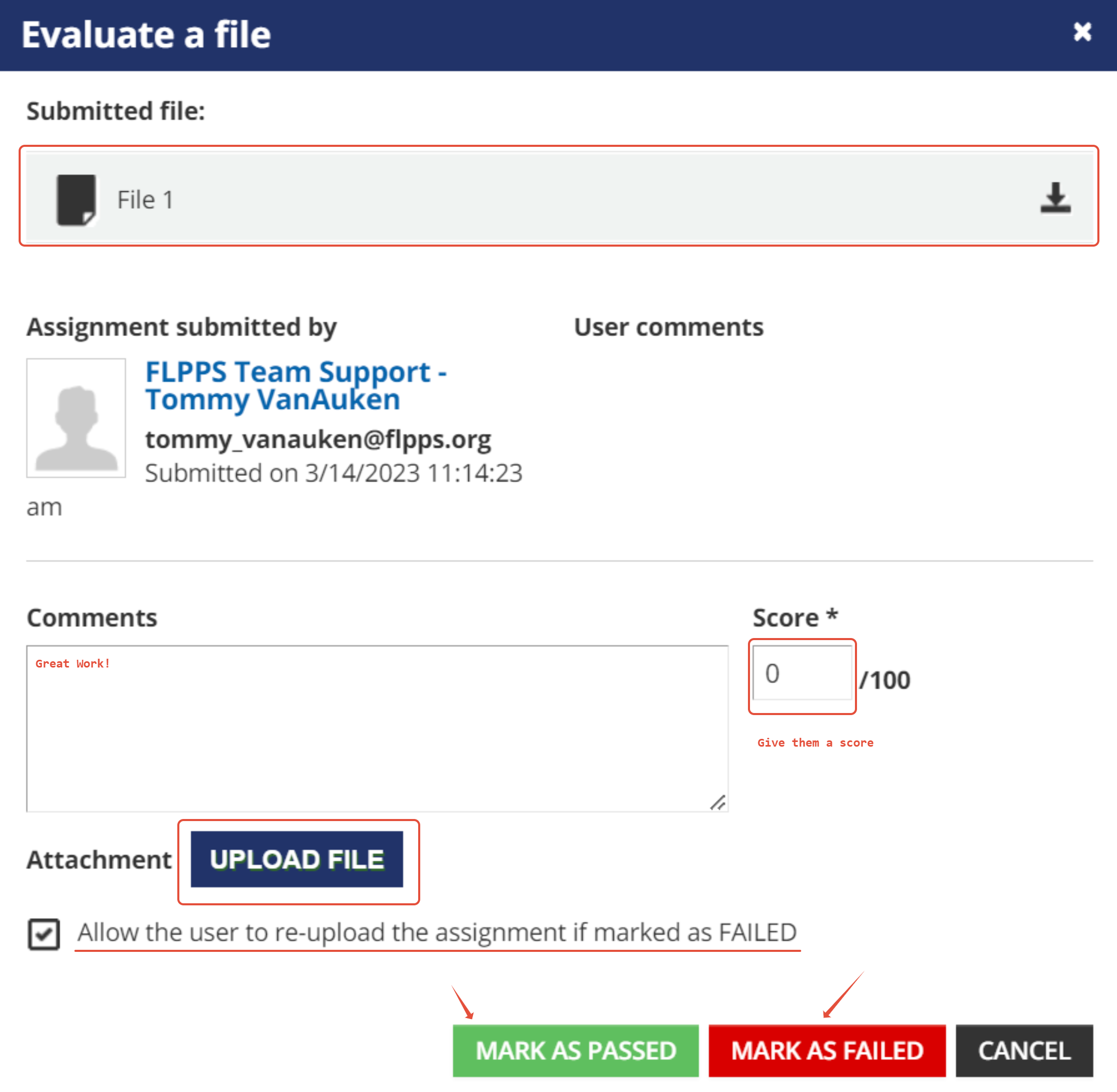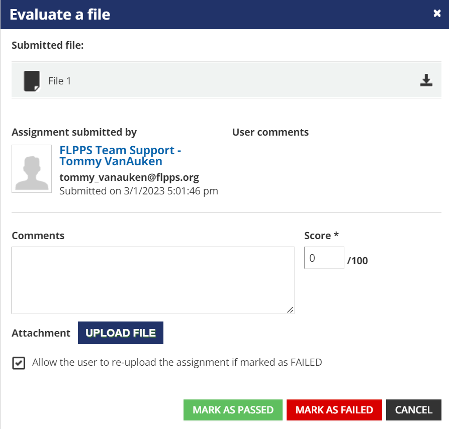 Once you reach the screen below, you will mark the assignment as passed or failed. If the user uploaded the incorrect certificate, you can mark it as failed, and the user will be able to try again to upload the correct certificate.