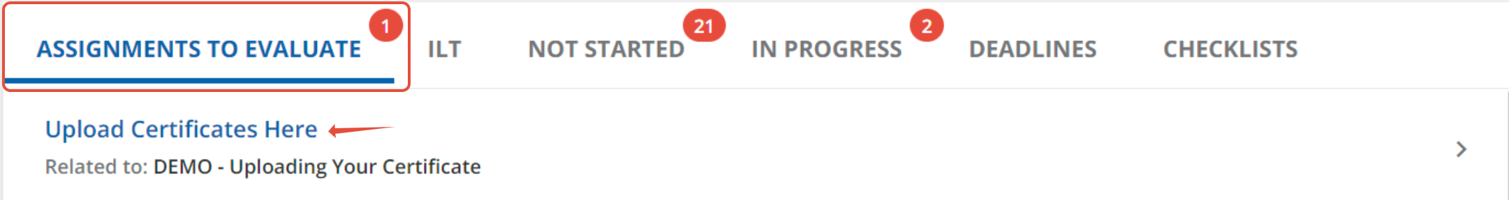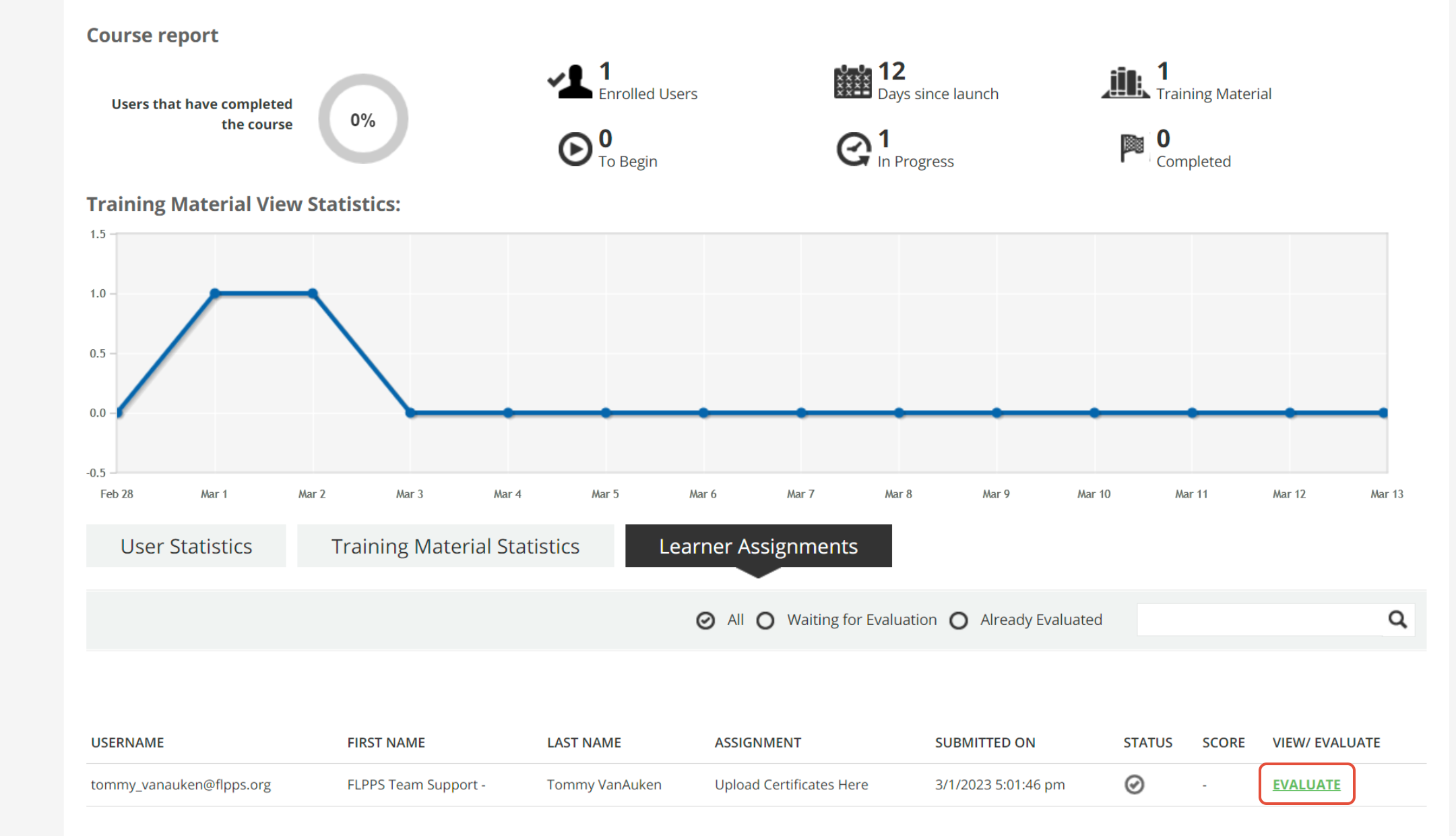 In the Assignments to Evaluate tab, click the training that you need to review.