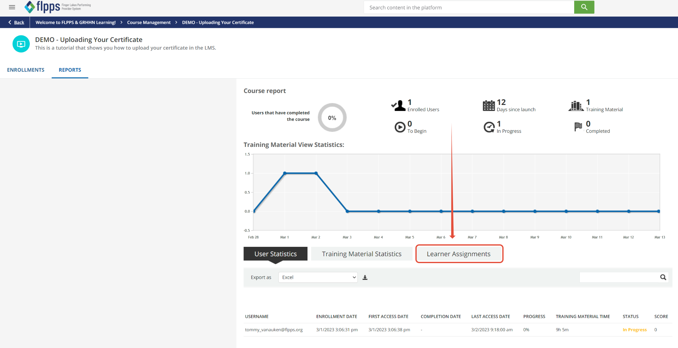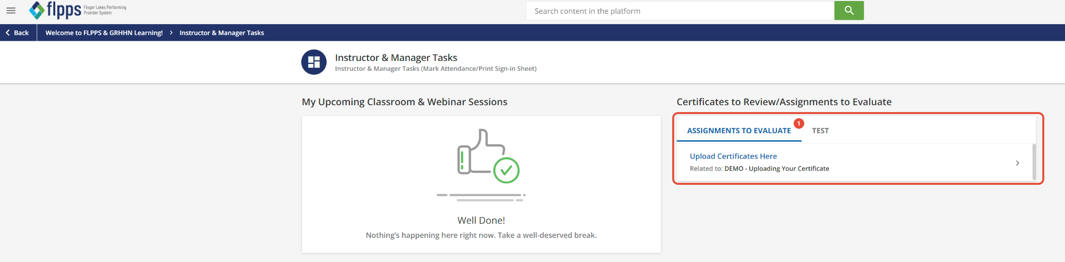 Another way you might encounter an Assignment in the LMS is when you assign training from an external partner in the FLPPS LMS. After users have taken their training on the external platform, they will submit a copy of their certificate to be approved. Here is how to view and Approve or Reject those certificates.
